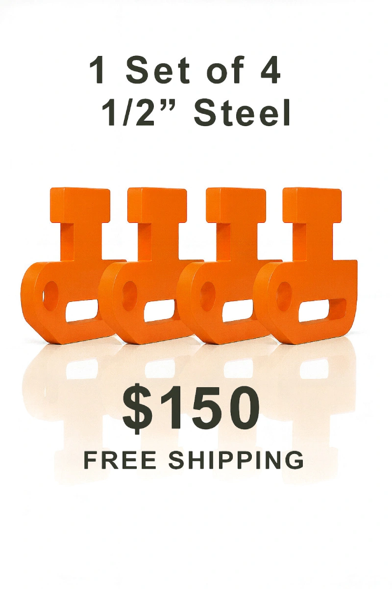 Each CQC is finished with a light coat of primer and can be painted any color for customization. Both the ½-inch and ¾-inch CQC models are designed to fit heavy 4-inch straps, rated for 5,400 lbs to 6,000 lbs of tensile strength. Each CQC is also equipped with a chain ring for additional load securing options.